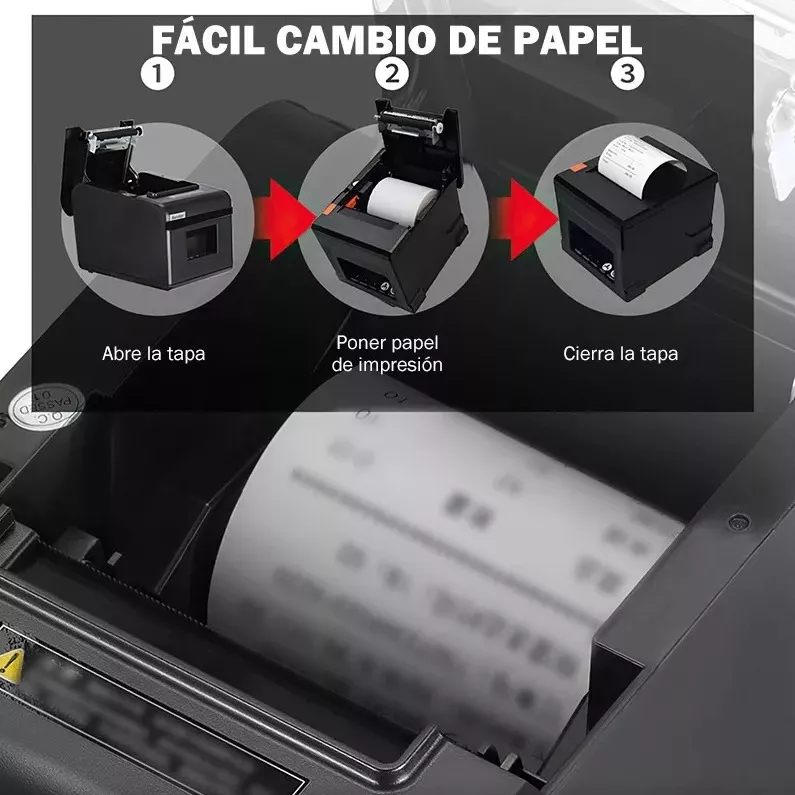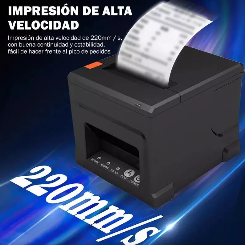 Ventajas: Admite avisos luminosos y sonoros para pedidos entrantes, corte automático de papel de impresión, función de adquisición automática de IP con protección de control de temperatura del cabezal de impresión y tecnología antiinterferencias del cortador.