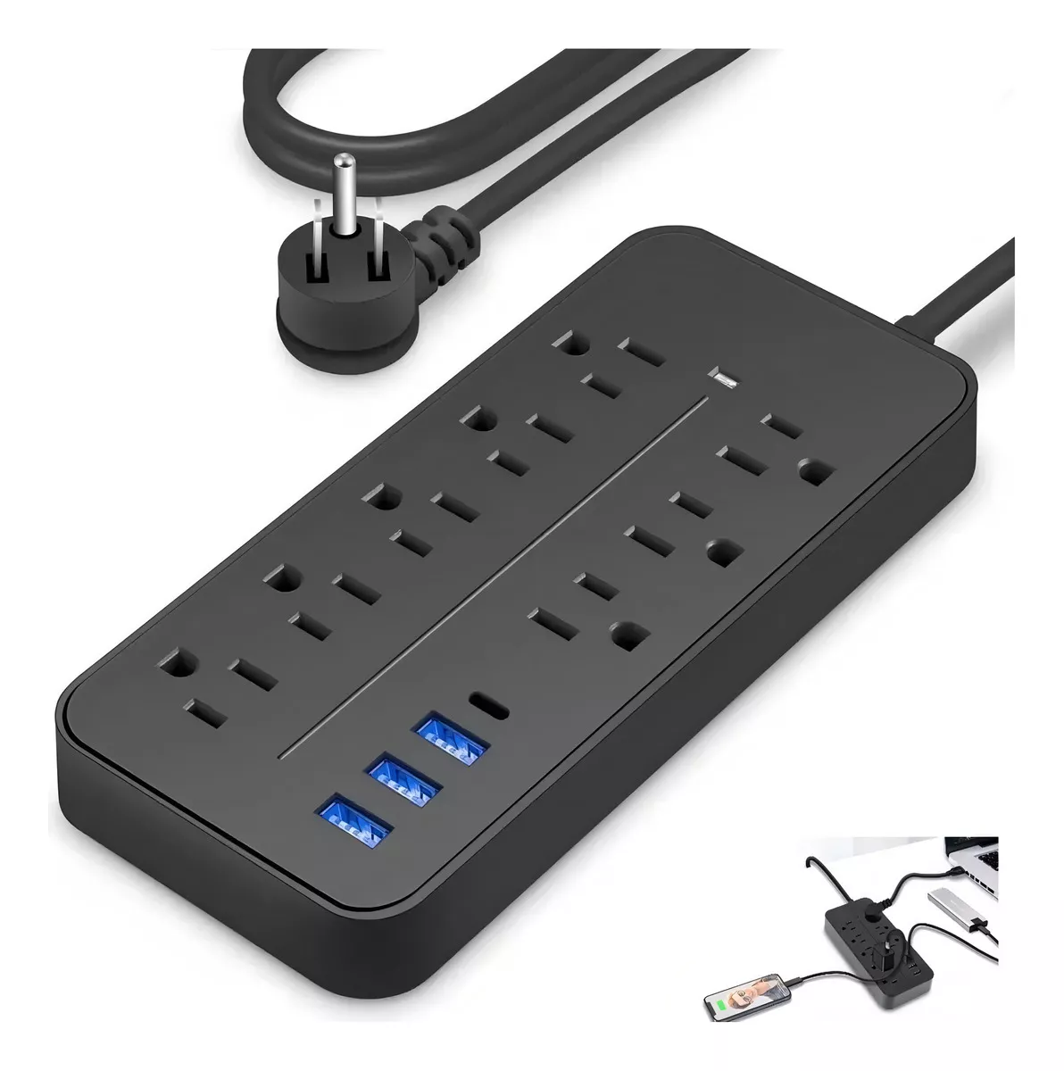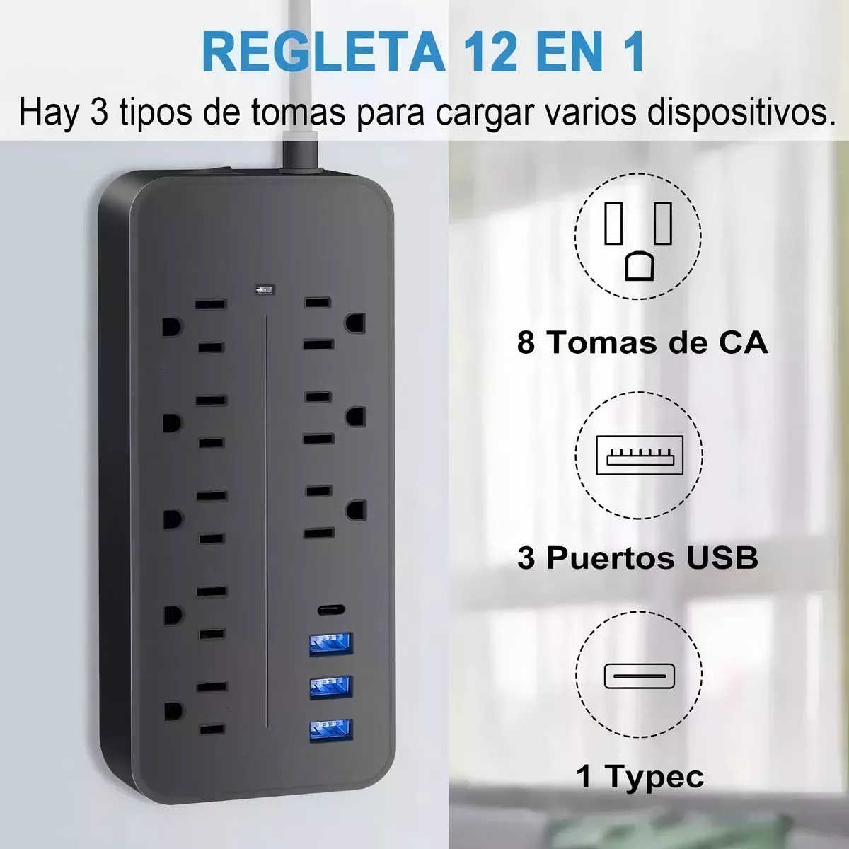– Regleta Multifunción 12 en 1: Regleta multienchufe compacta y portátil con 8 tomas de CA ampliamente espaciadas y 3 puertos de carga USB, 1 puerto Tipo-C, la regleta puede cargar hasta 12 dispositivos.