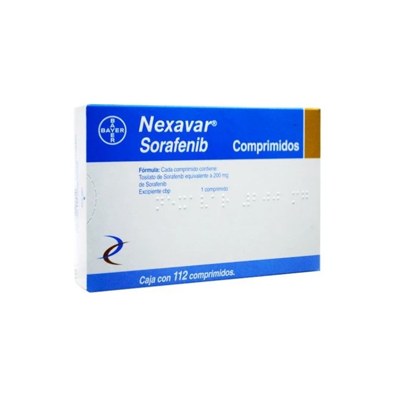 NEXAVAR 200 mg – Tratamiento oral dirigido para cáncer de hígado, riñón y tiroides. Caja con 112 tabletas recubiertas.