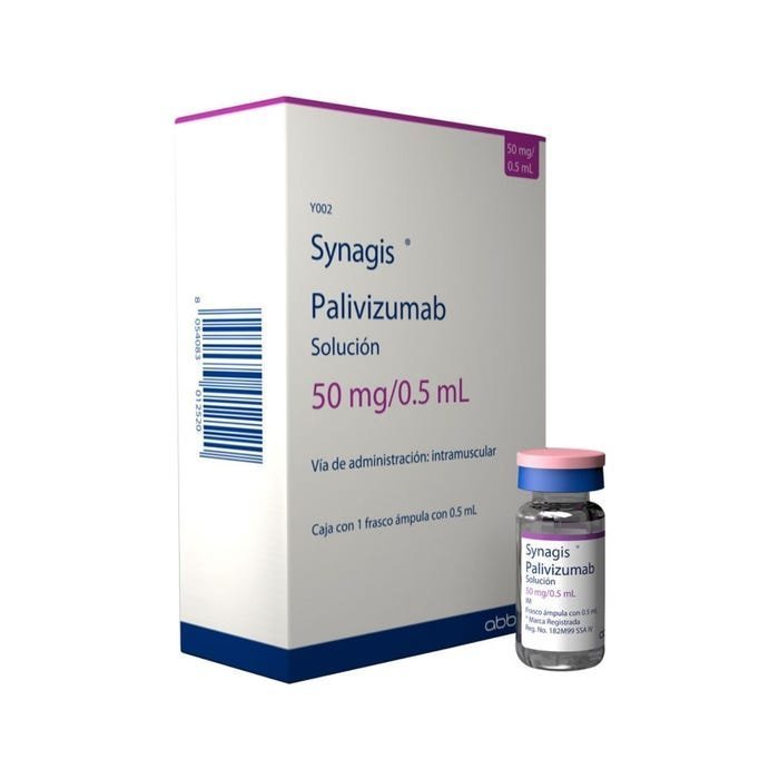 SYNAGIS (Palivizumab) 50 mg/0.5 ml es un anticuerpo monoclonal humanizado diseñado para la profilaxis del virus sincitial respiratorio (VSR) en lactantes prematuros o con condiciones médicas que aumentan el riesgo de infecciones respiratorias graves. Se administra mediante inyección intramuscular mensual durante la temporada de VSR para reducir hospitalizaciones por esta causa.