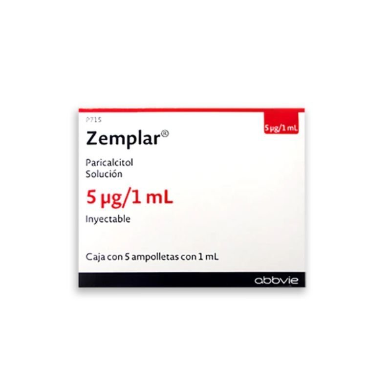 ZEMPLAR 5 mcg/1 mL – Análogo de vitamina D para el tratamiento del hiperparatiroidismo secundario en pacientes con enfermedad renal crónica. Caja con 5 ampolletas de 1 mL.